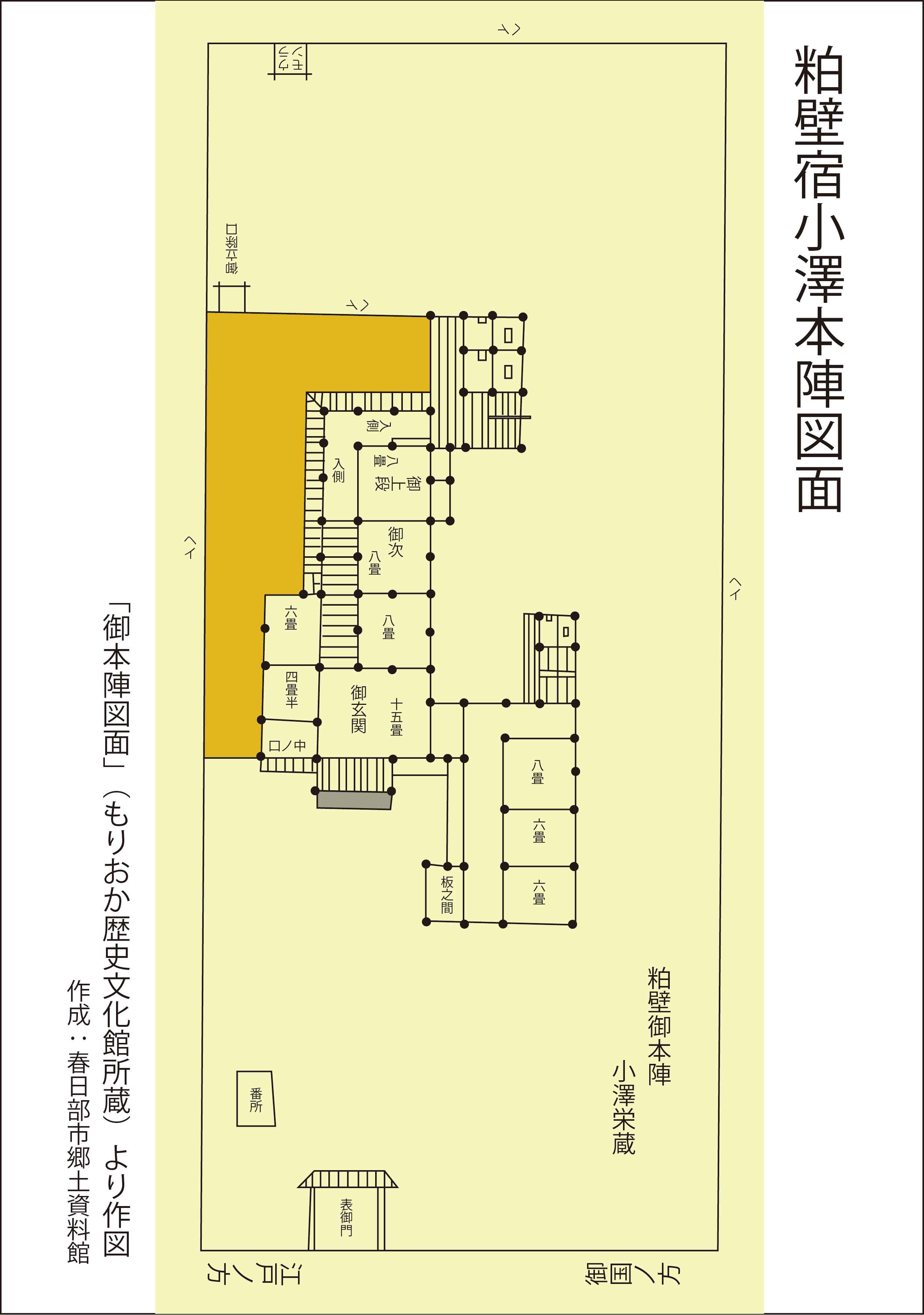 さらに進むと、宿場の南側に本陣(小澤家)がみえます。ここは現在群馬銀行の敷地にあたります。粕壁宿では本陣は四回移転しています。小澤家はもとは旅籠屋で、文化6年(1809)~嘉永2年(1849)まで本陣を勤めています。小澤本陣は粕壁で唯一屋敷の図面が伝わる本陣です。