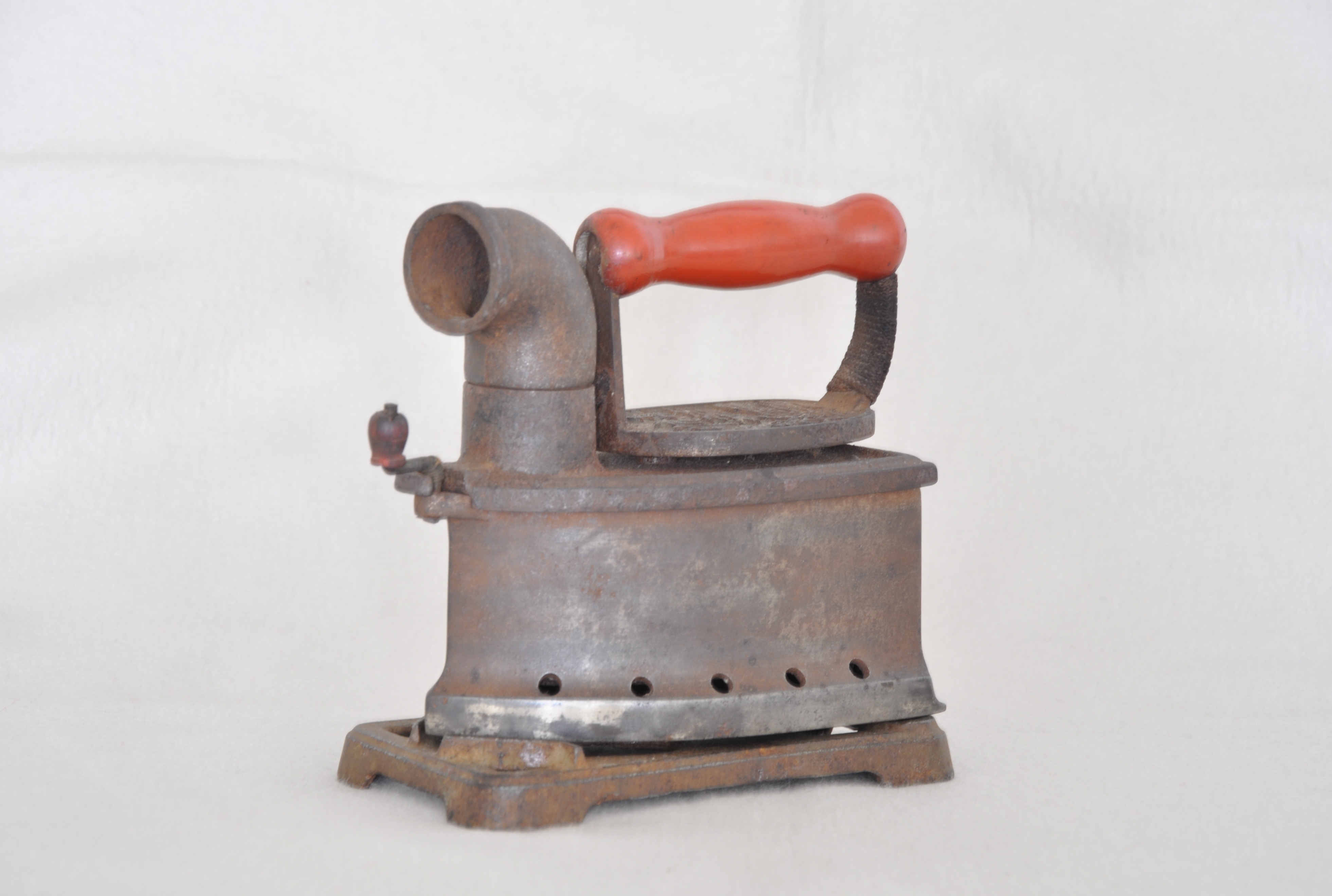 楕円形の鉄製の容器にパイプと取っ手がついている旧型の炭火アイロンの写真 拡大画像 (JPEG: 2.7MB)