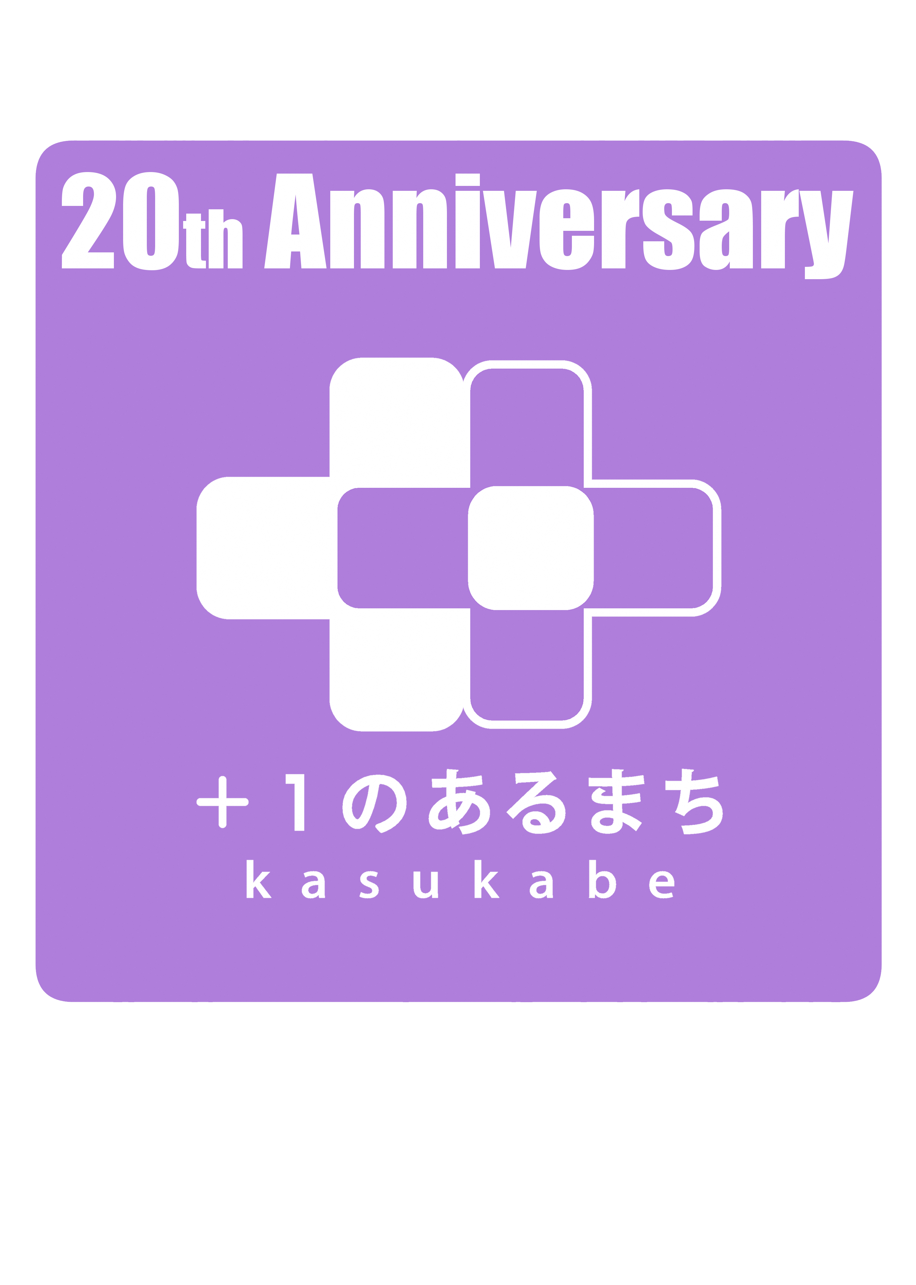 20周年を迎えるにあたり、「+1」という、皆様がそれぞれに持つ「春日部の魅力」を共有して、より一層まちを盛り上げていきたいという想いを込め、「+1のあるまちkasukabe」をベースに、市の花である「フジ」の色のスタンプをイメージしたデザインとしました。