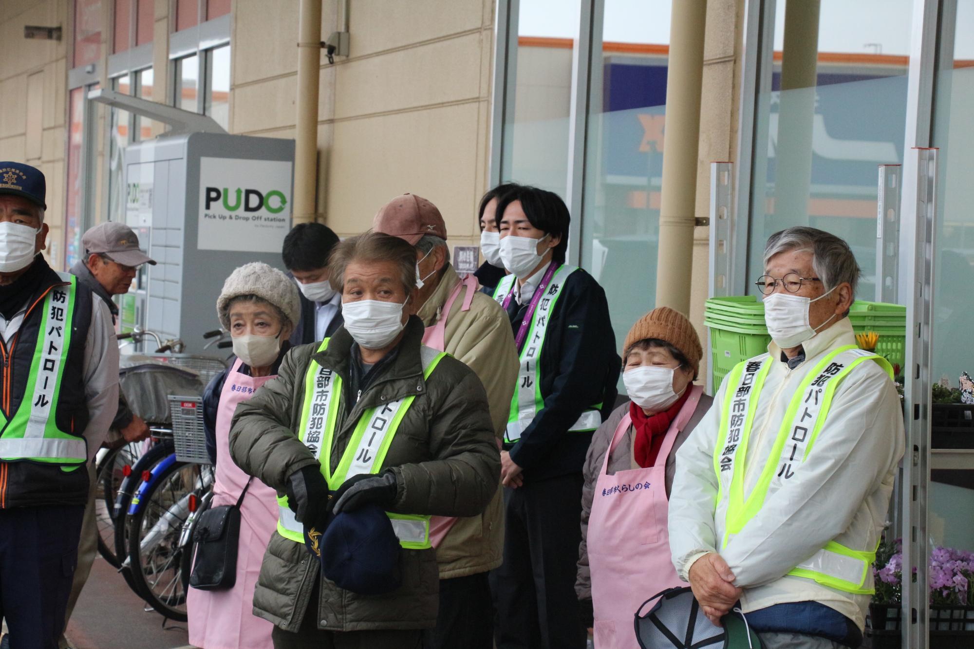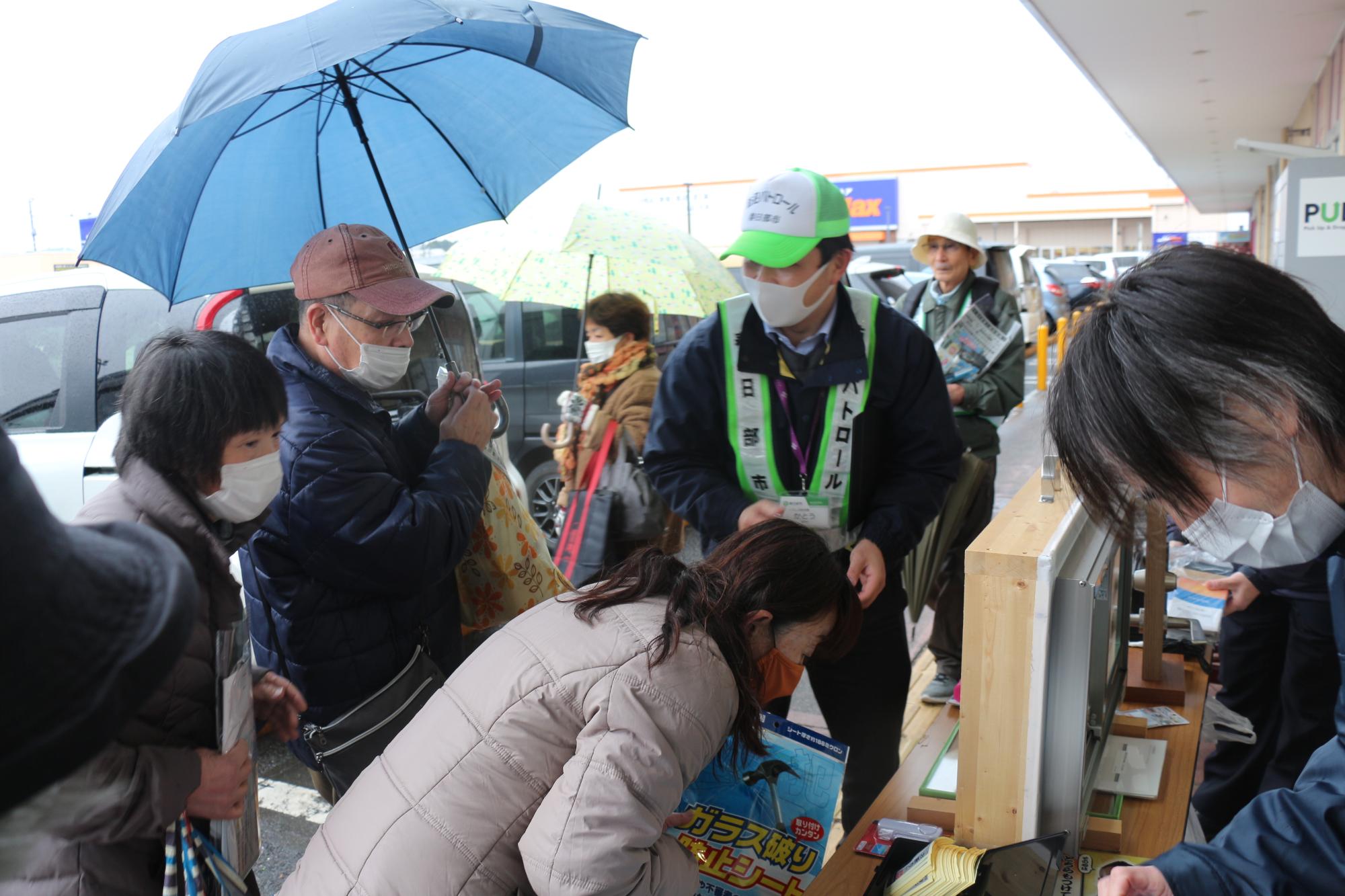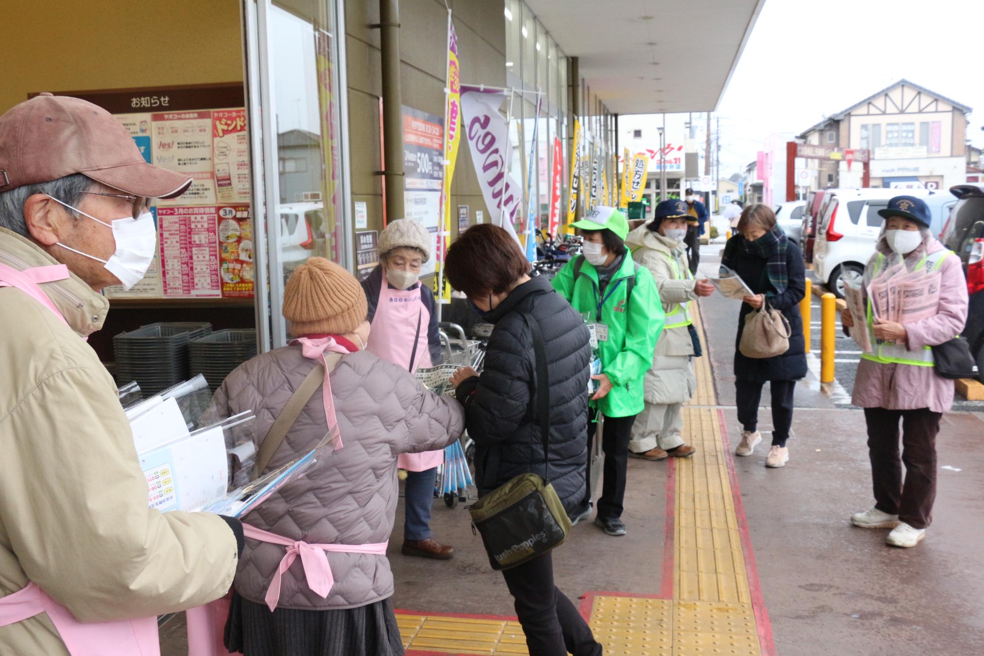 令和6年3月6日、庄和地区において、ヤオコー南桜井店及びミスターマックス南桜井店にご協力いただき、日頃より防犯パトロール活動にご尽力いただいている防犯ボランティア団体の皆さんと買い物客に対し、侵入窃盗や特殊詐欺被害を防ぐため、防犯フィルムなどの啓発品を配布し、自宅の窓や固定電話機の対策強化を呼びかけました。